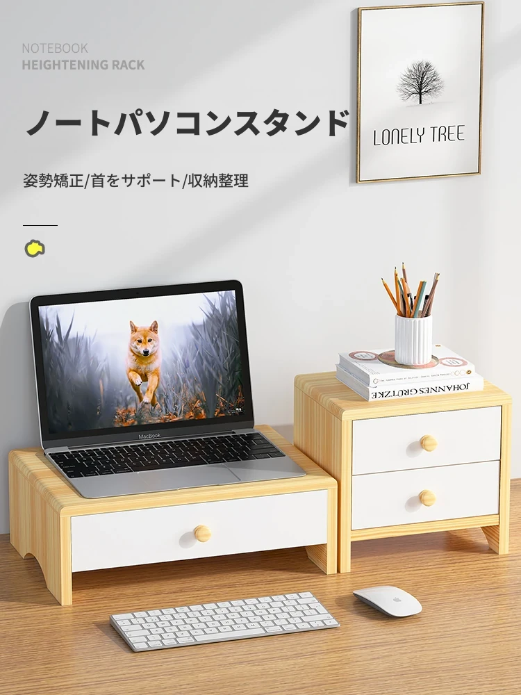 無需取り付け!天然木製ノートパソコンスタンド - デスクトップ収納ラック、モニターの高さを調整、便利な引き出し付きで快適なオフィス環境を実現!