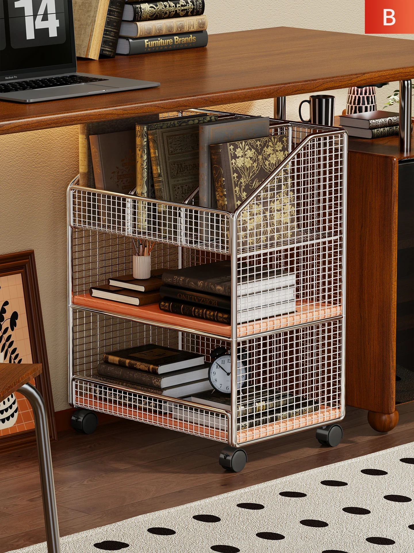 多層収納が可能な書斎用移動式ラック!デスク下にぴったりフィットし、書類や本をスッキリ整理。オフィスや自宅での効率的なスペース活用に最適な収納家具!